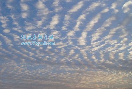 4、鱼鳞震云:由大块云团在几小时内形成的松散成鱼鳞状的云团,多与“多条震云”同时出现,云团深浅分明,现有观点认为浅的一端为震中,预示着2~6天以后的地震。
