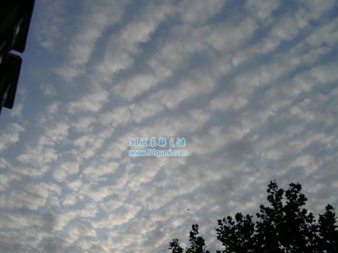 2、地震云边界清晰,此点有别于傍晚出现的辐射状高积云,也是几条长条形云延长交于一点。