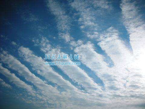 1、地震云外形呈细长条带状,有时如一直线,有似飞机的尾迹;有时为辐射状,数条地震云交于一点,如一把没有扇面的扇骨铺在空中;有时为干涉纹状,形似人的两排肋骨。奇闻呀 WWw.qIWENYa.cOM