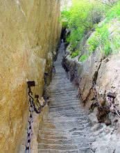 百尺峡“百尺峡”也叫“百丈崖”,两壁欲合,却被飞来的两颗石块从中撑开,人从石头下钻过,胆战心惊,生怕石块从两壁间掉下来,这就是“惊心石”。通过此石悬着的心才放下来,再回头看原来此处卡着的两块石头,是上大下小故能安然无恙,所以这颗石头也被称之为“平心石”。韩愈诗中有“俄然神功就,杀气见棱角”的描写。鹞子翻身鹞子翻身位于华山东峰,是通往下棋亭的必由之路,为华山著名的险道之一,其路凿于东峰的倒坎悬崖上,下视唯见寒索垂于凌空,不见路径。游人至此,须面壁挽索,以脚尖探寻石窝,交替而下,其中几步须如鹰鹞一般、左右翻转身体才可通过,故名“鹞子翻身”。近年华山管理部门已对鹞子翻身险道全面整修,凿深脚窝、石阶,多处更换了铁索。
