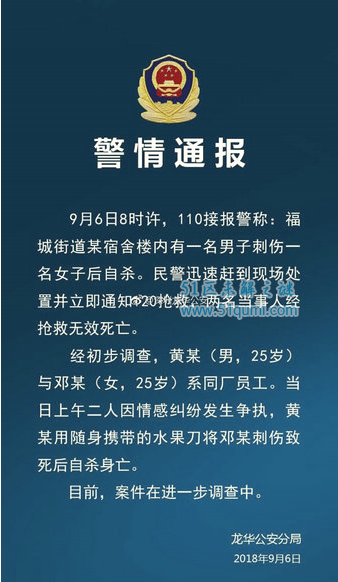 2018年9月6日上午8时许,110接报警称,福城街道某工厂宿舍楼内有一名男子刺伤一名女子后自杀,民警迅速赶到现场处置并立即通知120抢救, 两名当事人经抢救无效死亡。经初步调查,黄某(男,25岁)与邓某(女,25岁)系同厂员工,当日上午二人因情感纠纷发 生争执,黄某用随身携带的水果刀将邓某刺伤致死后自杀身亡。北青报记者从龙华警方处了解到,凶案发生在该福城街道观澜富士康一栋宿舍楼内。