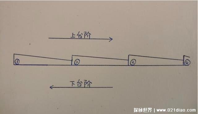而这里的悬魂梯其实原理并不难,其实是利用人在黑暗中的感官弱点而设计出来的,实际上悬魂梯的原理就像下面这张图所演示的那样子,在每一个台阶的末端的地方都会向下倾斜几厘米,这样子就会给人一种错觉就是在爬楼梯的感觉,但是实际上不管走多久都不会升高。