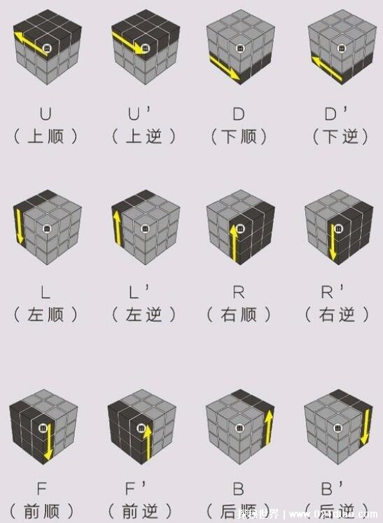 3.如果有朋友不知道口诀中的上、右这些是什么含义的话,先看这张图,上面介绍了详细位置以及调整的方向,可以用魔方按照上面的顺序都来尝试一遍,这样就可以熟悉的掌握魔方的转动的顺序,借助着口诀快速掌握还原魔方的规律。