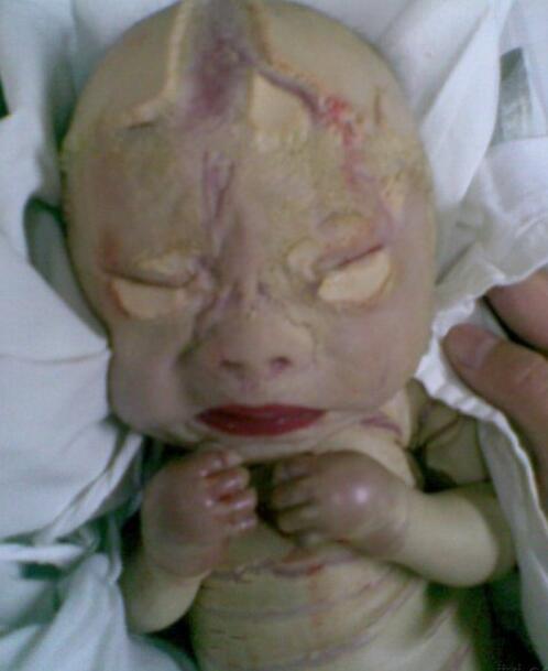 火棉胶婴儿是一种极为罕见的遗传病,婴儿时期全身就像被羊皮纸包裹住了一样,抚摸起来的感觉就如同塑料纸,甚至会导致婴儿眼睑向外翻,鼻子塌陷,鼻孔被角质堵住,需要经常清洗,耳朵也会因为这种病症的损害而变形,形成非常多的褶皱,看起来令人头皮发麻。