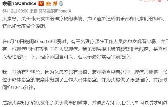 之后的余霜也是发表了道歉信息的,文中她表示自己开始并不知道这些按摩椅是给职业选手准备的,以为自己也是可以使用的。对此给职业选手造成的困扰余霜本人感到十分的抱歉。其实从这里面也可以看出余霜真的不是故意的,她本身也是从事这些赛事的解说,她也明白这些职业选手的情况,所以她使用按摩椅应该是真的不了解真正的情况,而且之后的道歉也是诚意满满。
