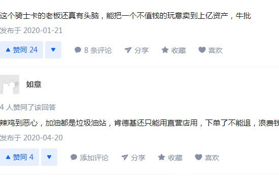 另外还有用户举了一个肯德基的例子,在骑士卡上这也是有优惠的,但是这只限于肯德基的直营店使用,要是你自己不小心下单了还不能退。还有人对于骑士卡商城的服务也不是很满意,有用户在上面购买了商品,后来发现有问题,找客服,但是客服并不是卖家的客服,这就导致解决这件事情变得十分麻烦,这样的购物体验相信很多人都不喜欢。