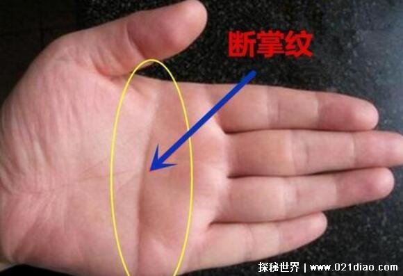 断掌并不是真的指手断了或者怎么样,那么到底什么是断掌呢?其实就如图所示,断掌指的就是手掌上一条很长的纹路,一般人手掌上的纹路都比较短,是不会从左到右横贯整个手掌的,如果有这种纹路,就被称为断掌,断掌的人一般手的韧性比较好。