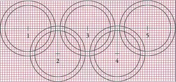 奥运五环是由5个大小相等的圆环,自左向右两两紧密交叉,形成上方三个圆环、下方两个圆环的形状,整体呈现一个底部小的等腰梯形。该标志是1913年由奥运会创始人皮埃尔·德·顾拜旦构思设计,并且亲自上色,成为奥运会最重要的标志。