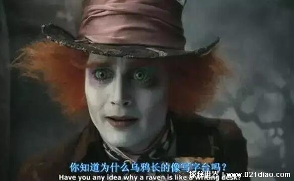 “乌鸦为什么像写字台”出自《爱丽丝梦游仙境》,当爱丽丝第一次来到仙境时,幼年的爱丽丝就被会跳快乐屋的疯帽子吸引,有一天爱丽丝对疯帽子说:“我喜欢你。”