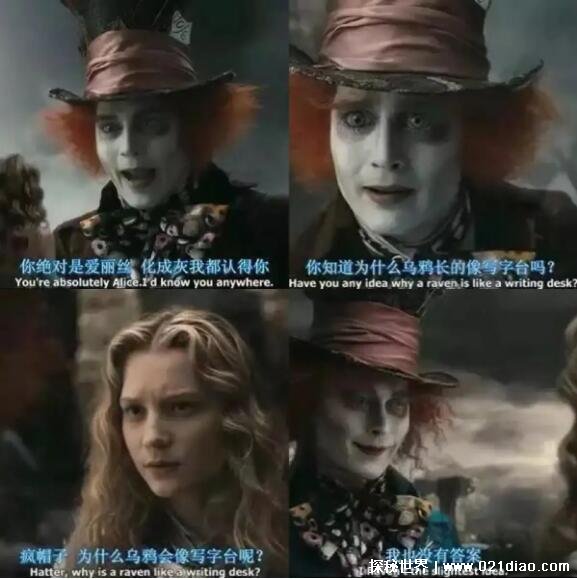 然后疯帽子就明白了,天真的爱丽丝是在说喜欢他没有任何理由。可是后来爱丽丝要离开了,临走的时候疯帽子说:“你会忘掉这里的一切的”,爱丽丝或:“不会的,因为乌鸦像写字台”。