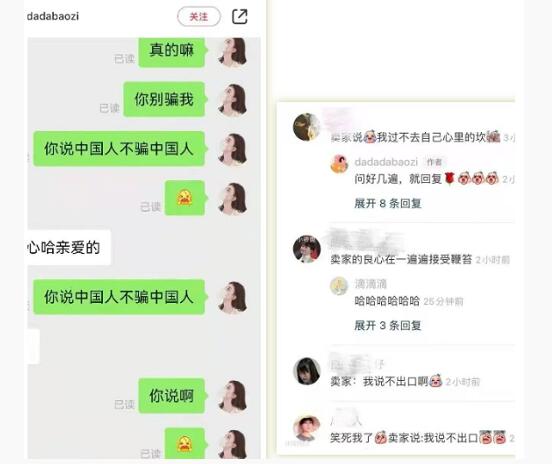 因为买家害怕买到的是假货,所以要求卖家说出“中国人不骗中国人”这句话,其实就是让卖家对自己的产品做出保证,结果卖家一直说不出口,而是用其他表情来敷衍,说明无法对自己的产品做出保证,于是在网上火了起来。
