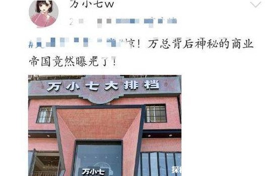 之前万小七自己就爆料称发现了自己背后的商业帝国,这里当然是调侃的说法,所谓的商业帝国其实就是指万小七的大排档,万小七的大排档就是万小七大排档,从外面看装修不算太好,但是比路边一般的大排档还是要好不少。除了大排档网红之外万小七还是演员,出演过《许少的隐婚甜妻第一季》,另外她也是配音演员,很多动漫都有万小七的配音。