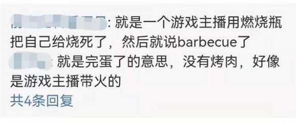 另外一层意思是“玩完”、“完蛋”,通常用中文“芭比q”代表,起源于游戏主播,当时直播玩游戏时,使用燃烧瓶烧到自己的时候,会用芭比q来表达情绪,原意是被烤熟了、人体烧烤的意思,火起来之后就演变成“玩完”、“完蛋”的意思。