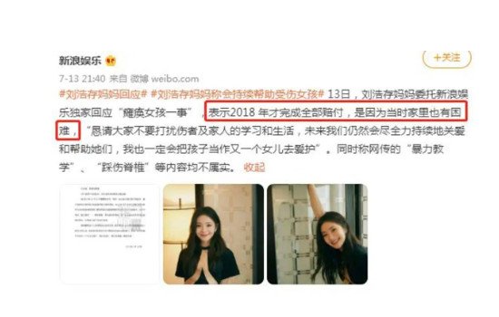 直到2018年的时候在法院强制执行下才赔付了小女孩所有的费用,但是这个时候小女孩儿已经错失了最佳的治疗时间,现在小女孩儿已经半身瘫痪了,终身都只能在轮椅上生活了。对于为什么2018年才赔偿,刘浩存母亲回应当时自己家里也十分困难,实在是赔不起这么多钱。但是网友却发现2012到2018这段时间刘浩存的生活显然不像是没有钱的样子,各种奢侈品数不胜数。网友称要是当时将刘浩存花的这些钱赔偿给小女孩,那么小女孩也就不用瘫痪了,因此网友也称呼刘浩存是吃人血馒头长大的。奇闻呀 Www.qiWeNYa.CoM