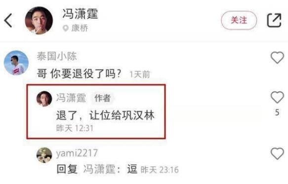 巩汉林被怼后,发小视频回应:“我是不懂足球,但是我会看比分”。骂战热度持续身高,冯潇霆也发文表示:球员很心寒,中国足球不要键盘侠。甚至在之后与网友的互动中,有网友问“哥!你要退役了吗”,冯潇霆回复:“退了!让位给巩汉林!”