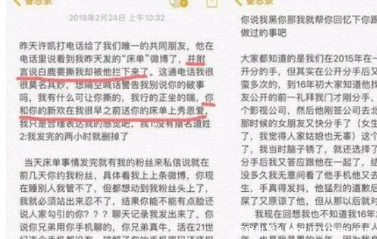这件事还是许凯前女友的爆料,根据许凯前女友爆料称许凯火了之后就甩掉了自己然后和白鹿在一起了,并且还说白鹿和许凯很早之前就已经有不正当的男女关系了,并且还爆出了许凯白鹿两人之间露骨的聊天信息,紧接着又爆料称两人已经同居了,而同居的床单还是许凯前女友之前用的那一条,这也就是所谓的许凯白鹿床单事件。一时间很多人都说许凯白鹿私生活混乱,两人的演艺事业也一度受到影响。