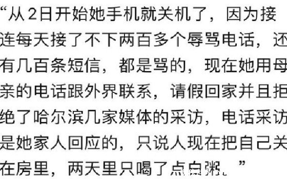 现在张美玉等6人已被所在学校通报批评,而张美玉本人已经请假离校返回家里了,根据她的家人回应,她现在将自己反锁在家里,两天只喝一点白米粥,并且手机完全不敢开机,一开机都是几百天辱骂她的短信和电话。整个人都已经抑郁奔溃了。